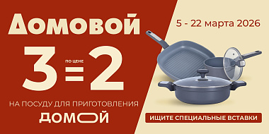 Акция действует с 05.03.2026г. по 22.03.2026 г. в розничном магазине «Домовой» на посуду для приготовления ТМ «ДОМОЙ», выделенную специальными вставками «3 по цене 2».