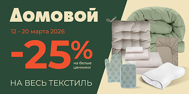 * Скидка действует с 12.03.2026г. по 20.03.2026 г. в розничном магазине «Домовой» на весь текстиль с белыми ценниками по купону с предъявлением дисконтной карты «Домовой».
