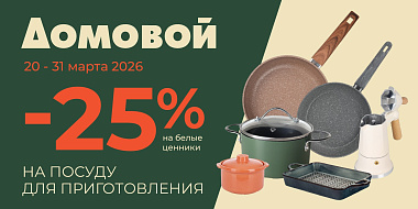 Скидка действует с 20.03.2026г. по 31.03.2026 г. в розничном магазине «Домовой» на посуду для приготовления с белыми ценниками по купону с предъявлением дисконтной карты «Домовой».