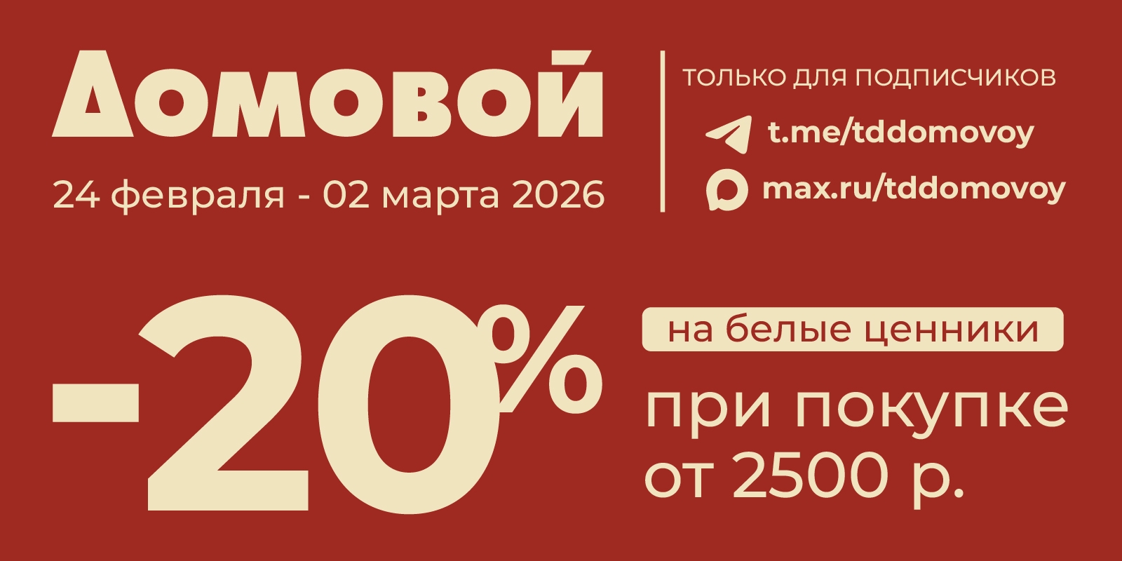 * Скидка действует с 24.02.2026г. по 02.03.2026 г. в розничном магазине «Домовой» на белые ценники по купону с применением дисконтной карты «Домовой».